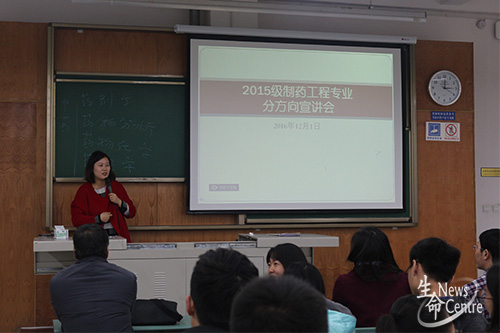 宣讲会伊始,由张小荣老师为同学们介绍相关知识。他谈到,中药制药和化学制药的大方向相同,即两个方向的基础课程差不多,只有专业课稍有差异。相对而言,化学制药比中药制药对化学学科要求更多更高,他建议对化学比较感兴趣且对化学基础知识掌握较好的同学可以选择化学制药。