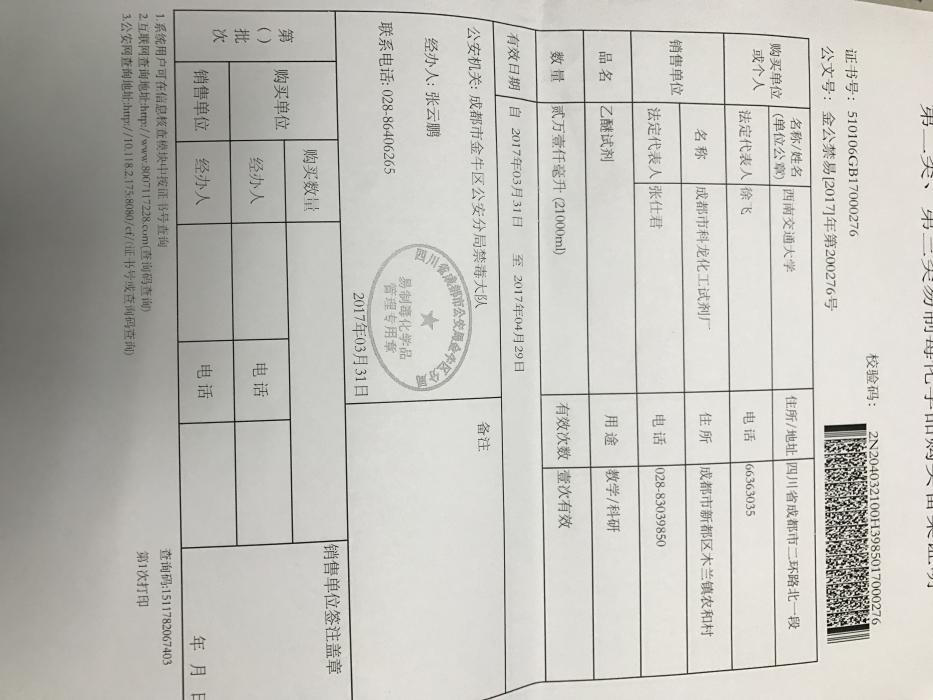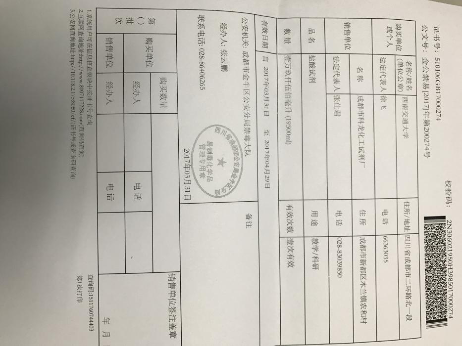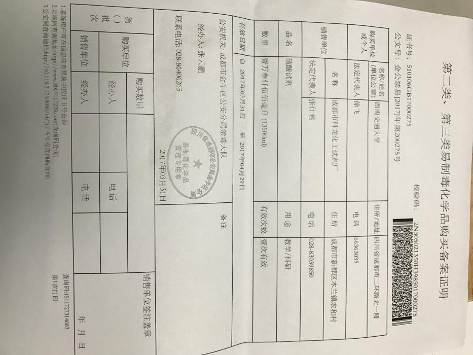 根据各位老师上个月提交的购置申请,目前已经依次完成资实处审核、保卫处审核、学校备案、与销售单位签订合同等环节,由资实处通过四川省易制毒化学品管理系统向公安部门申请到了所需的配额(备案证明见附件),备案证明的有效期为一个月(3.31-4.29),所有老师的购买必须在此规定时间内一次性完成。