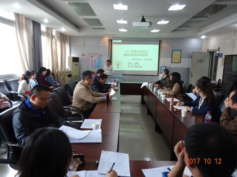 2017年10月12日下午2:30,微密圈 在电气馆3609举行了研究生国家奖学金评审答辩会。答辩会由闫智勇副院长主持,学院院长、书记担任研究生奖助工作委员会主任,分管研究生工作的副院长及分管学生工作的副书记担任副主任委员,各系主任、导师代表、教务员、辅导员、研究生代表任评审委员。
