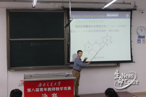 在天然药物化学专论的课堂上,蒋合众老师通过歌曲名《花儿为什么这样红》引入本讲课重点——红花成分黄酮类化合物。在对黄酮类化合物概念、生物活性、基本结构和分类进行介绍后,蒋合众分别对类属黄酮类化合物的黄酮、黄酮醇类、二氢黄酮醇类的来源、结构、作用进行详细讲解。他利用本讲课介绍的知识为同学们讲解红花中的黄酮类化合物在红花经历淡黄、深黄后,通过干燥及酶的作用,导致花最终呈现红色,并鼓励同学们课后阅读相关文献。在评委评议环节,蒋合众老师因授课思路清晰、课堂知识有深度,获得评委一致好评。