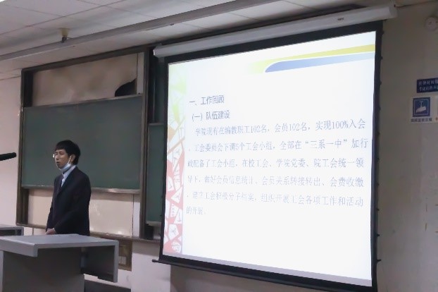 大会现场气氛庄严热烈,全体参会代表精神饱满。大会在雄壮的中华人民共和国国歌声中开幕。会上,主持学院第四届工会工作的赵钢锋同志以“凝集民心,汇集力量,温暖生命,攻坚克难,生命有我”为主题,向大会作第四届工会委员会工作报告。工作报告全面回顾了2016年来在校工会和学院党委统一领导下,学院工会在队伍建设、制度建设、疫情防控、关注青年教师成长、关爱女职工群体、对外宣传、维护职工权益、教工之家及文体活动等方面的工作。工作报告还针对学院工会未来在队伍建设、制度保障、团结教职工、关爱关心青年教职工、加强职工权益保障与维护等方面提出了工作构想与展望。工作报告会后,学院工会第四届工会委员会赵钢锋同志向大会汇报了微密圈