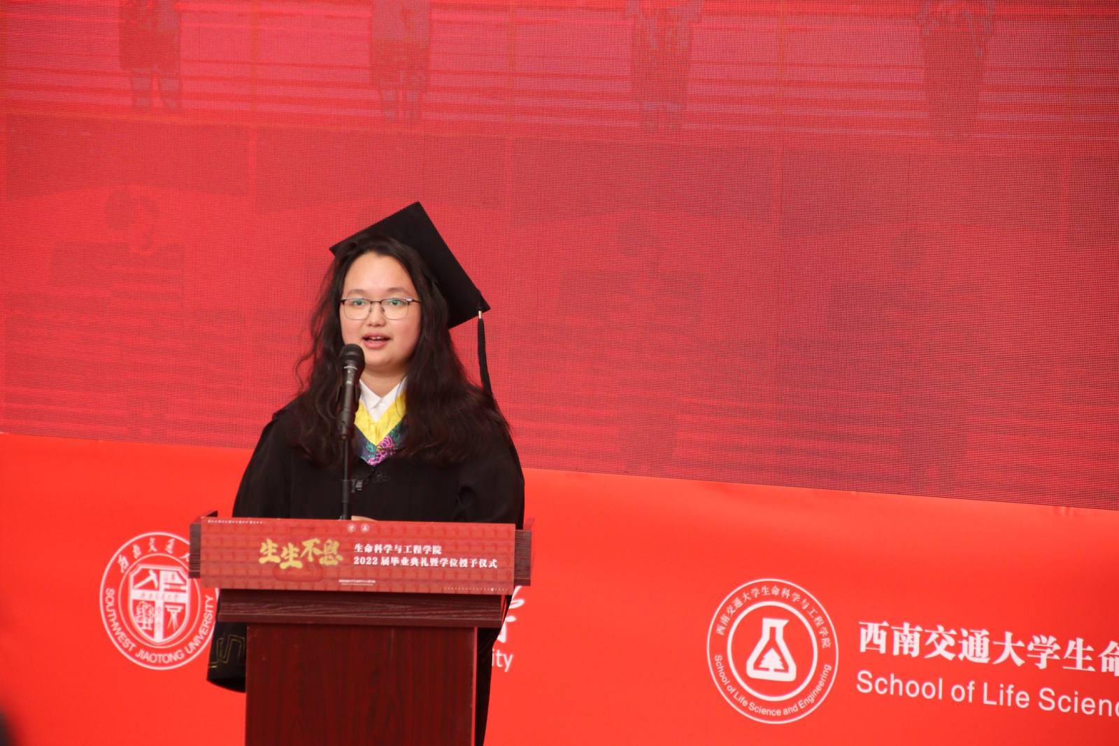 在犀浦校区三号教学楼一楼下沉广场举办2022届毕业典礼暨学位授予仪式。学院党委书记葛永明、院长周先礼等院领导与全体毕业生一起现场参加典礼。由于疫情未能返校的部分毕业生和亲友通过观看图文直播的方式线上参与典礼。典礼由吴亦鸣同学主持。