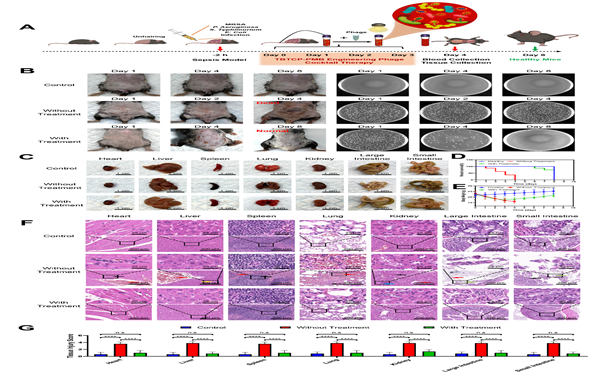基于TBTCP-PMB工程化噬菌体的体外高效抗菌性能,通过构建小鼠败血症模型进一步考察TBTCP-PMB工程化噬菌体的体内抗菌性能。研究表明,与对照组相比,未治疗组小鼠出现大量瘀斑、红斑等典型败血症症状,并于第4天全部死亡;用TBTCP-PMB工程化噬菌体处理的治疗组小鼠瘀斑、红斑症状随着时间延长而明显减少,第8天大部分小鼠仍存活,并对其器官进行H&E染色分析,治疗组的脏器病变均有所改善,组织学特征完整。由此证明TBTCP-PMB工程化噬菌体可以显著杀死宿主细菌并提高败血症小鼠的存活率。接着采用多因子检测败血症小鼠的免疫应答反应,结果显示用TBTCP-PMB工程化噬菌体处理并经白光照射的治疗组小鼠中炎症因子的表达均受到明显抑制。以上结果表明该工程化噬菌体对宿主细菌的靶向和杀伤作用及光敏剂在光照下能高效产生ROS用于细菌的高效灭活的多重功能相结合,赋予其良好的生物相容性的同时实现对宿主细菌的快速识别并高效灭活,进一步抑制炎症因子,改善组织纤维化,有利于细胞增殖、血管生成和组织修复,从而促进小鼠败血症的治愈和改善,表明TBTCP-PMB工程化噬菌体在败血症治疗中具有巨大的应用潜力。
