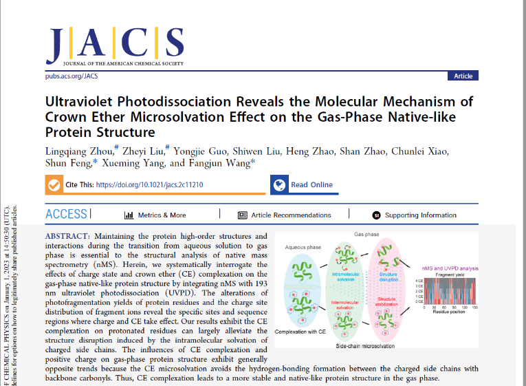 “生命分析技术与材料”封顺教授团队与中国科学院大连化学物理研究所王方军教授和杨学明院士团队合作的最新研究成果“Ultraviolet Photodissociation Reveals the Molecular Mechanism of Crown Ether Microsolvation Effect on the Gas-Phase Native-like Protein Structure” (DOI: 10.1021/jacs.2c11210)。论文共同一作为我校2020级硕士研究生周伶强和中科院大连化学物理研究所刘哲益副研究员,通讯作者为封顺教授和王方军研究员,微密圈