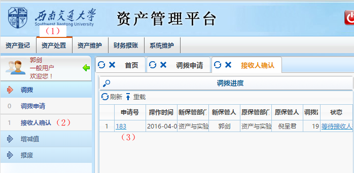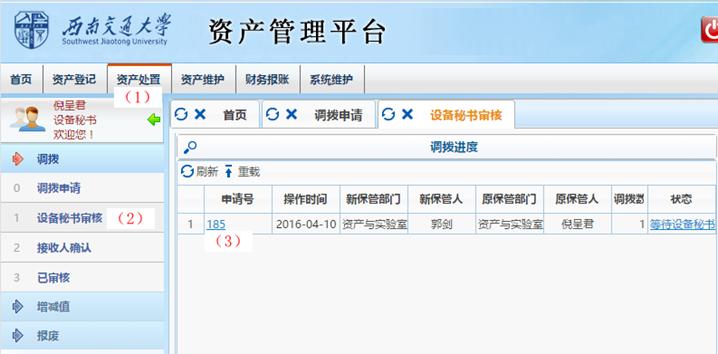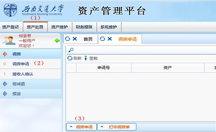 2、登录后,依次点击(1)资产处置(2)调拨申请(3)调拨申请
