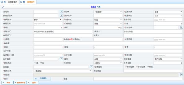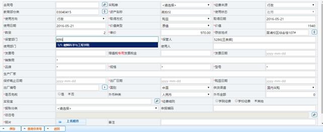 (3)填写保管部门和保管人。例如:输入“材料”,系统自动提示“1/1材料科学与工程学院”条目后,选中该条目。