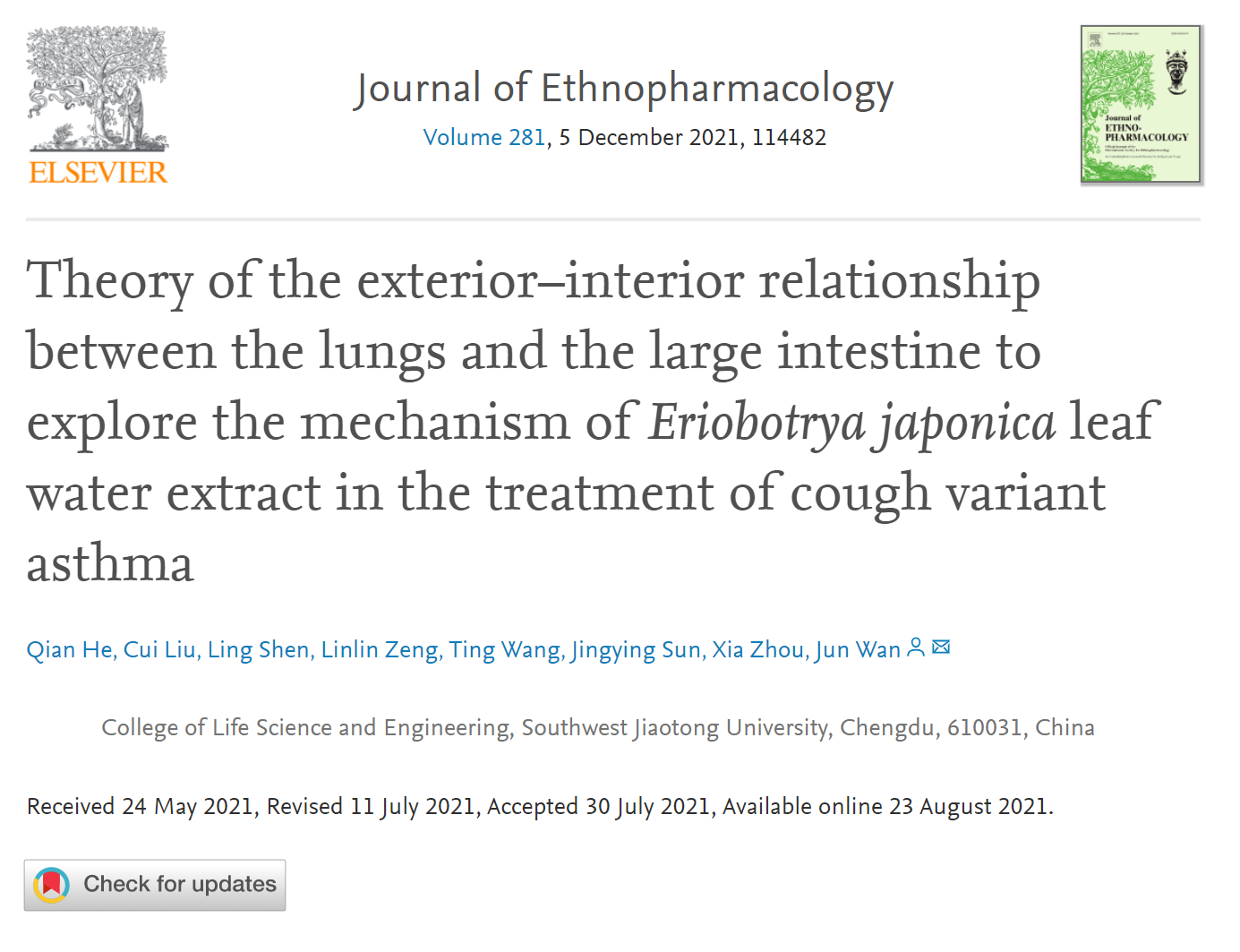 微密圈 万军课题组在中药药理学权威期刊《JOURNAL OF ETHNOPHARMACOLOGY》上发表高水平论文
