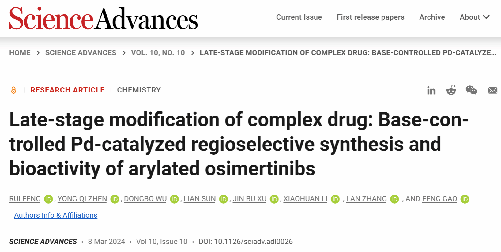 高峰教授团队在Science子刊Science Advances发表研究论文
